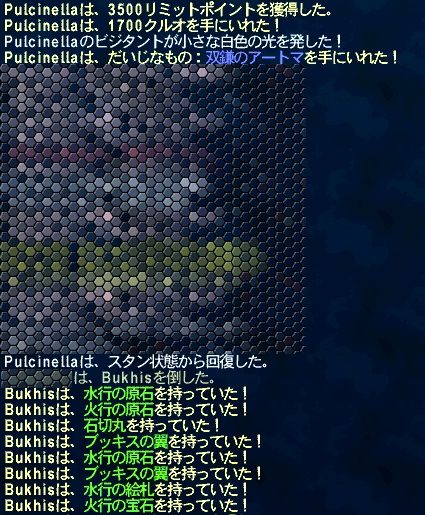 その後、えりんぎさんの希望もあって、アビセア-ブンカールのジンNMをやって足型紙をとった。私もおこぼれでぴえとろのオリゾン型紙:足とか、あとキノコNMもやってぎゃれんのランサー型紙:足とかをもらってホクホク。時間延長出まくってもったいなかったのでブッキスのトリガーを取ってアートマを狙うことになった。
