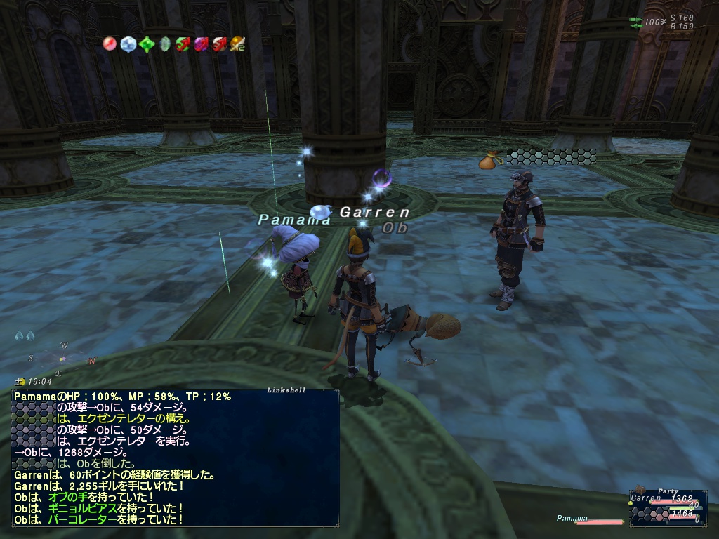どうもこのObという花鳥風月NM、PTメンバーにからくり士/サポからくり士がいると、いれたマニューバの数に応じて形態が変化する模様。今回は射撃戦フレームを相手にする作戦なので雷と風のマニューバを合計2個以上入れることにした。途中とちって光マニュだかを2つ入れて白兵戦フレームだかになったけど、すぐ風マニュを入れて射撃戦フレームに戻した!
