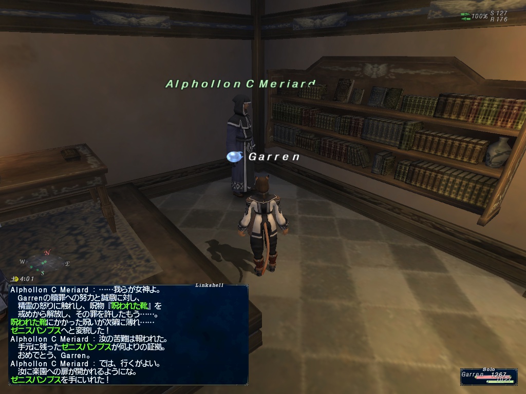 先日から競売をちょくちょく見てたら、とうとう「呪われた靴」の出品に遭遇しましたよ!10万ギルで落札して解呪しにサンドリアの大聖堂に行ってきました。