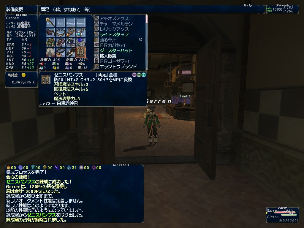 これだけだとMPが50増える微妙性能な靴ですが、2011年5月のバージョンアップでオーグメント性能が付加出来るようになったんです。必要なものは、ゼニスパンプスと海霊免罪符の断片。錬成を完成したら、オーグメント性能を定着しようがするまいが断片を消費するようです。断片合計27枚、1枚9900ギルで10枚、10000ギルで17枚買ってオーグメントを付加しては定着させず、を繰り返して最終的に決定した性能は3回目に錬成した時に付いた性能だったという…。