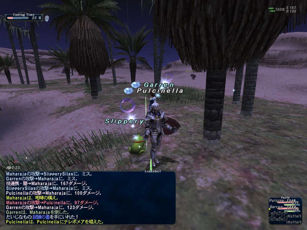 トライアルソードを貰ったので潜在消し。残り@125で一旦別のことを(たぶんまたんごさんのAFクエの件)をやって、終わってから戻ってきて再開。連携はGarrenのヘキサストライク>Pulcinellaのスピンスラッシュで光連携。でんどんもその頃短剣スキルが230に到達してトライアルダガーで潜在外し。せいたんの花車>でんどんのシャークバイトで光連携をやってたっぽい。