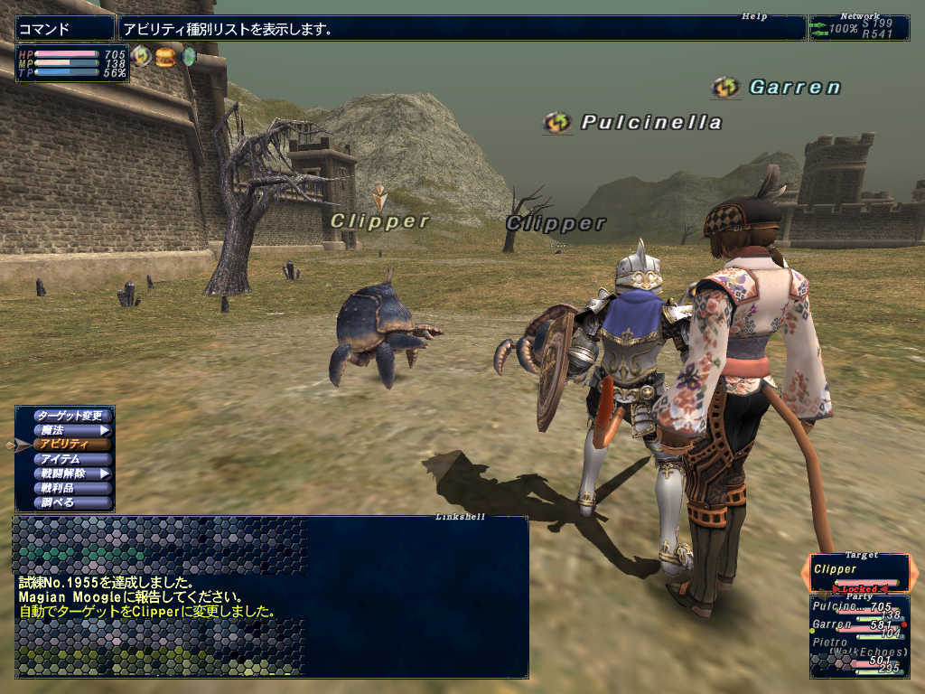 Lv39狩人にシンクしてバタリア丘陵〔S〕のカニをつつく。土天候時に。こっちのレベルも低いのでちょっと時間かかったけどなんとか28ポイント分倒す。6匹である。