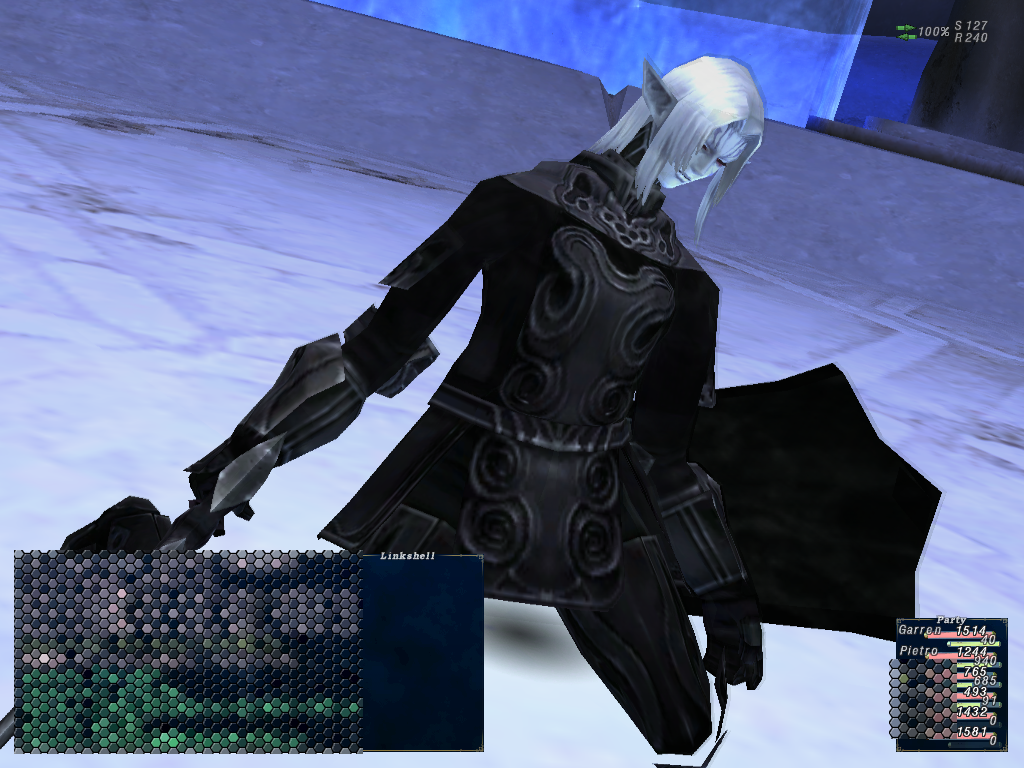 こんな構成だったと思う。でんどんが死んだ後ぷるさんで盾をしつつ弱点を探る。闇属性WSらしいのでシャドーオブデスを撃つべくぎゃれんを黒/戦にチェンジして撃ったら当たり。青弱点はなんだったか。弓術だったか?よく分からない。突いたかどうかも覚えてない。