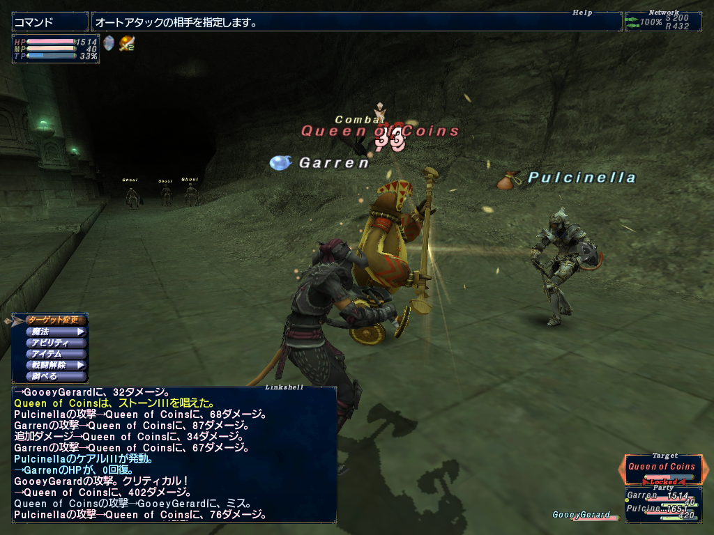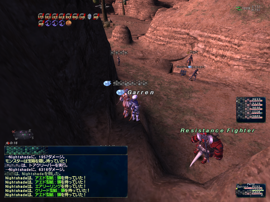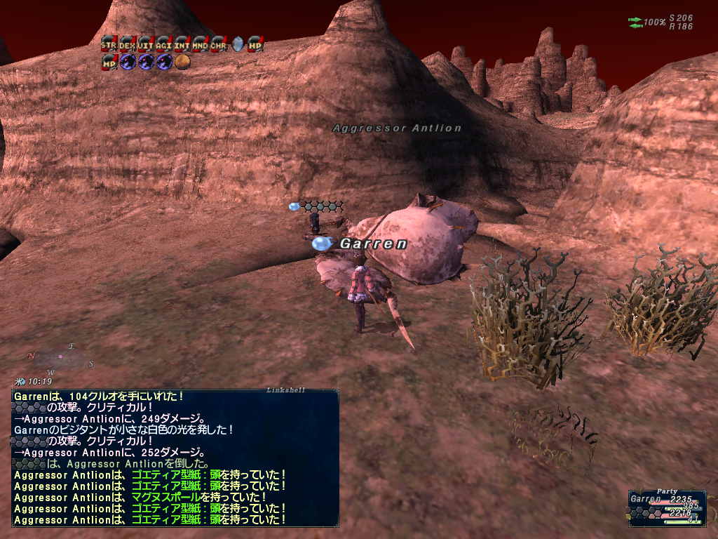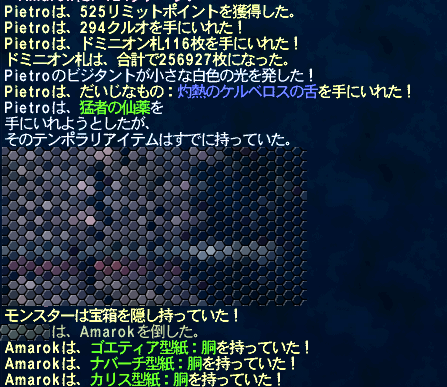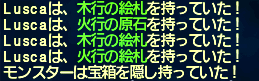 とかやってたら、野良でソロって有色VNMのルスカ(ゾミト族)をやってた忍/踊の人がsayで弱点をお願いできませんかー?と言っていたのでPTに誘って華麗に弱点を付いて(魔法吸収されたけど!)目当ての五行がでたっぽい。