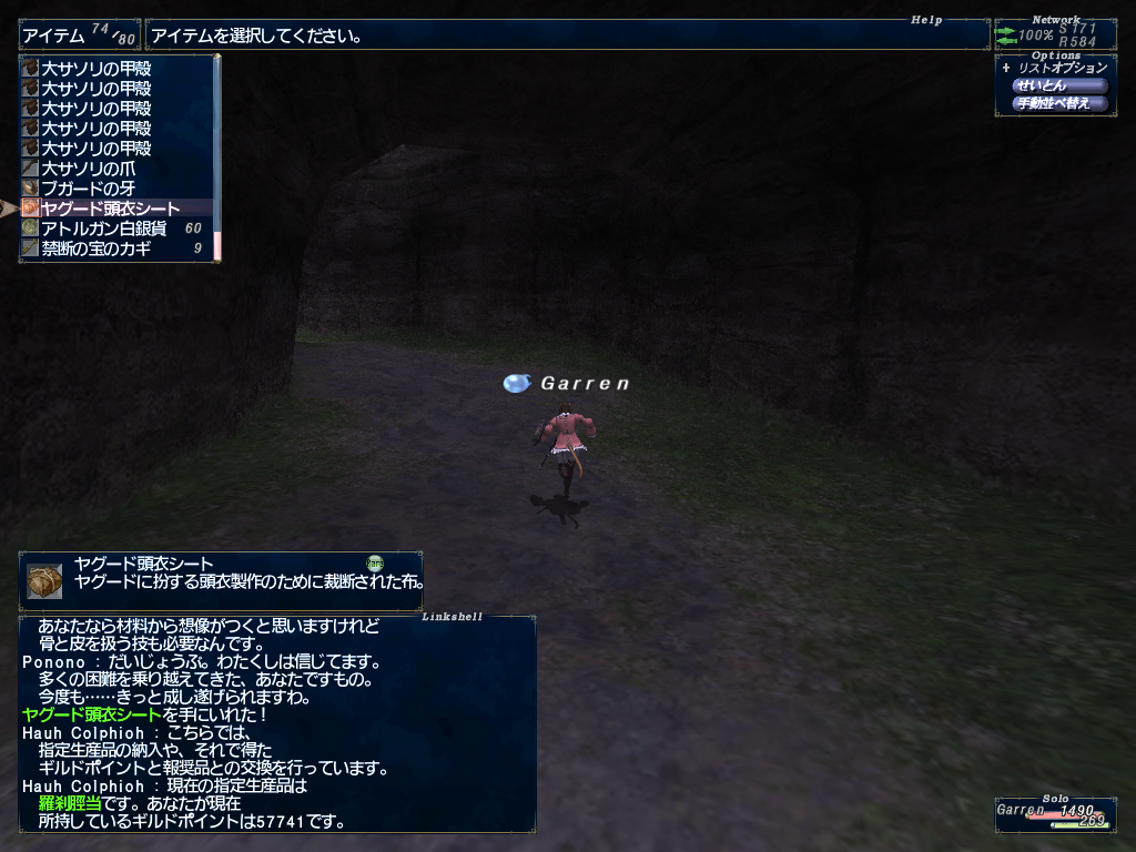 いよいよクエストで指定されたアイテムと1万ギルをトレードしてキーアイテムの「ヤグード頭衣シート」をゲット。