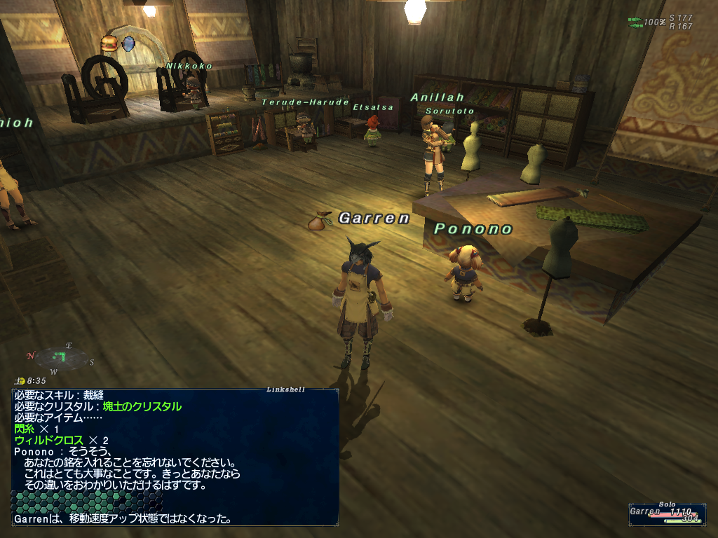 こつこつ上げてた裁縫スキルがとうとう98になった。先日のバージョンアップで追加されたような気がする高級職人試験を受けるべくPononoさんの所に行く。