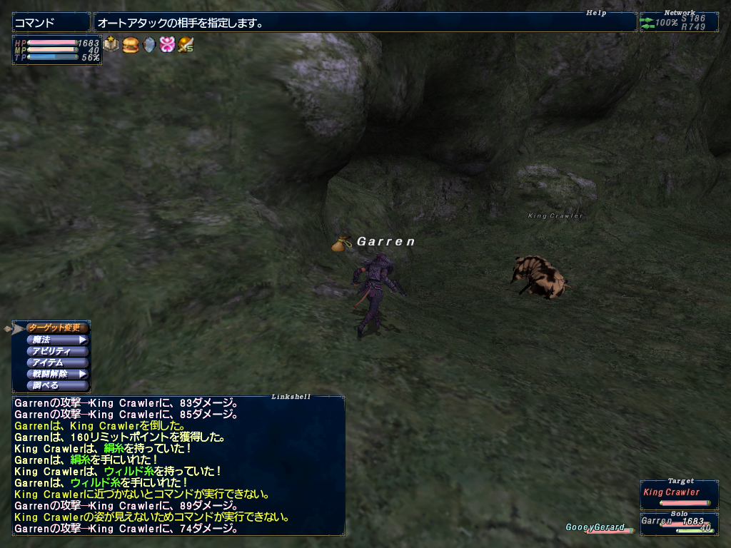 閃糸は確か水蜘蛛の網を紡げばできるはず。ウィルド糸はLv90以上のクロウラーが落とすらしい。それを3本集めて織ってウィルドクロスにする。らしい。クロ巣の配置換えで設置された高レベルクロウラーのKing Crawlerをやるべく、万全の準備のためメリポを振る。
