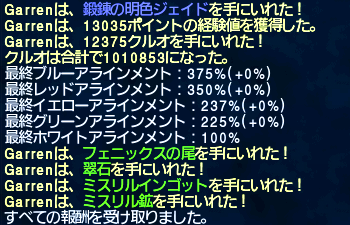 1匹目は弱点つけなかったのでドロップせず。ぐぬぬ。メイジャンでクァールを160匹ほどボコる。ぼっこぼっこ。ドロップした皮はジャコたんに送りつける。で、2匹目だかのチュクワ。青弱点を何とか付いてクリードカラーをドロップしたぞー^^