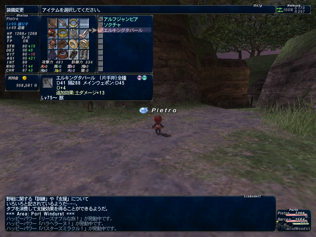 その後、ブラックヘイローの潜在を外すべくアビセア-タロンギの亀相手にぴえとろとしりさんの2人コンビで光連携。エクゼンテレター>ヘキサストライク。ぴえとろのくせにメリポWSに1段階振ってて、スキルも360位あるので使えるのであったエクゼンテレター。潜在外れてロ・メーヴでNMやって無事習得できたらしい。おめでととすー^^
