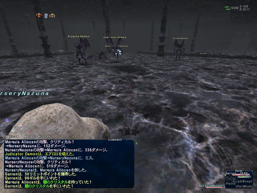 作戦を練ることにした。護衛ウィヴルは練るらしいので、夢想花を使ってねかせてから護衛ウィヴルを1匹ずつ撃破。ボスのクゥダフはHPが75%、50%、25%の時にインビンシブルを使うんだけど、そのとき以外は痛いWSを使ってこないらしい。まあ、護衛ウィヴルを全部倒してからぴえとろがタゲを持つ形でボスをボコってたら、インビン来て痛いWSもきた!蝉が2枚残ってたけど、追加効果のスタンを食らったらしく、動きを止められて死亡。その後、しりさんがとんずら使ってインビンを回避して云々かんぬん。まあ、なんていうか、普通にインビン中もスタンが入るみたいなのでサドンランジ入れればよかったらしい。まあなんとか勝利して報酬をゲット。