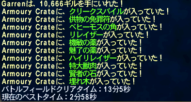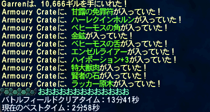 そして見事なクソドロップ。まあ特大獣肉が100%ドロップだからいいけど!後日ちゃーんが獣肉を売りさばいたあと、私の獣肉をちゃーんに押しつけた^^