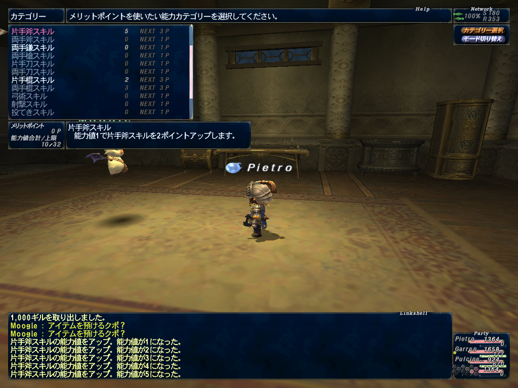 ぴえとろの獣使いもLv99になって、片手斧スキルが追いついていないので、スキル上げする前に片手斧スキルにメリットポイントを振ることにしたよー。