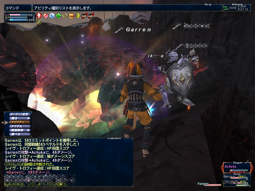 で、5月3日になって23時~の炎竜公アチュカ戦の準備で現地に22時前に到着したら、22時突入の団体がいたようで。主催者さんの当初の予定では編成するため22時45分に集合だったそうだけど、アチュカは倒されてから最長3時間リポップしないとかで、ちょっと悩んだ末?突入することにしたっぽい。その当時のモリマー台地のコロナイズレートが70%超えてたので、アチュカは1アラ程度の人数で既にHP50%切ってたみたい。後発団体も乗り込んだのであっという間にアチュカさん死にかけて、一緒に突入したぬこたんは全然稼げず装備でなかったそうであった。ぐっすん。