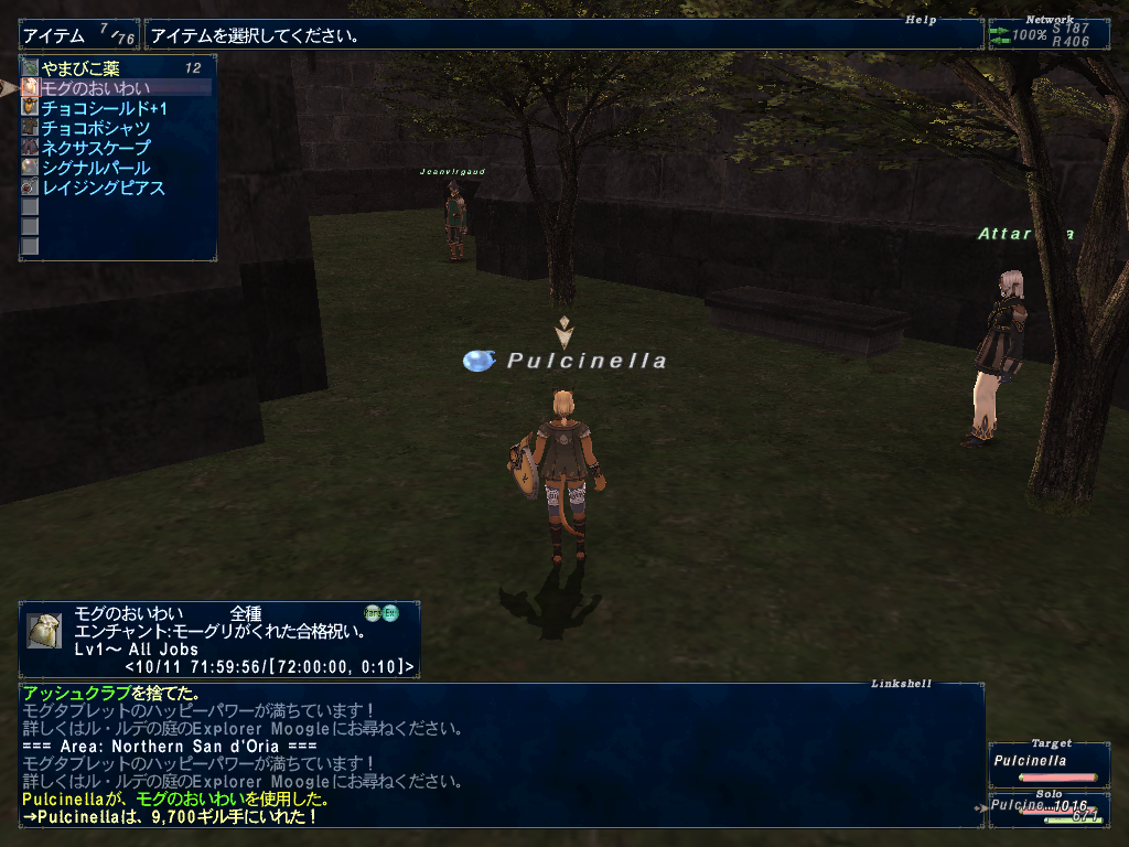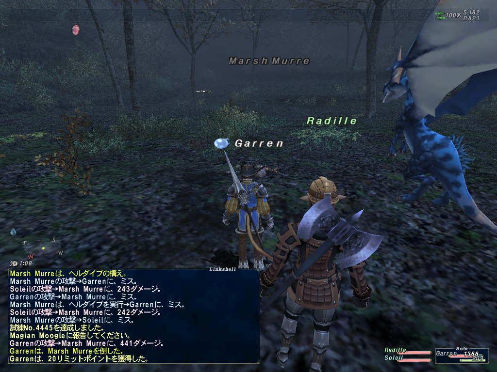あと、でんどんのプロマシアMをやるべく、ギルド桟橋のトンベリNM4匹、ビビキー湾の頭足NM、ミザレオ海岸のブガードNMをやった。次は「武士道とは」だぜー。
