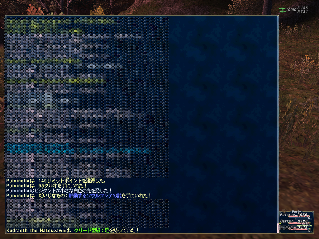 ララ水道のスカーム最初の1回は時間切れになりそうで、@10秒のところでぱっきーが髑髏の鍵を使ったけど間に合わずに排出された!ってか普通にNM位置が書かれた地図を拾ってきて見てたのに道を間違えたってか、最南のNMをやるのを忘れて進行して時間切れコースになった系だった。