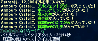 上の画像がしりさんのオーブ、下の画像が私のオーブ。なんでも私の回で出たポールグリップは競売履歴25万だとか。その他の素材や武器はゴミですがね!あと、1回ソロで破滅の壺に行ったけどやはりレイズIIIは出ませんでした。グヌヌ。