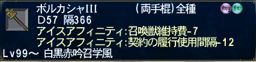 で、ヴァルナの杖+1完成。そこから氷の石印15個納品でヴァルナの杖+2、さらに氷の石印40こ納品でヴァルナの杖+3、さらに女王の透石を15個納品でボルカシャIIIの完成である。ヴァルナの杖+2の画像だけ撮影してなかった。
