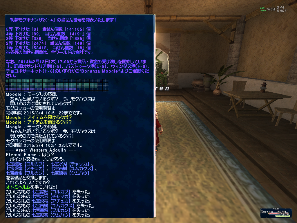 メインキャラの七支公討伐エミネンス項目報酬、いわゆる七宝が消費できてないので、メイン垢のサブキャラ、Moondoggieちゃんにオトミヘルムを送りつけて自分用にオトミヘルムをもらいなおす等。