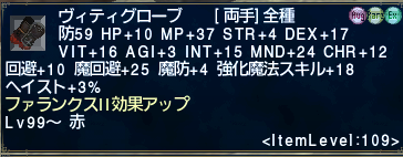 これもIL119にするにはちょっとお金がかかるので放置中。まあ最近セラエノクロスを2枚ほど取れて1枚100万ギルで売れたのでイグドリア原木代の半分は回収できたので、ヴィティタバードか何かをIL119にしてもいいんですけど、先立つレムがない。