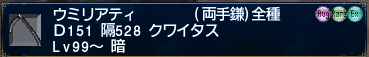 あ、アイテム欄を4枠以上圧迫していたリミナルレジデとトリックダイスを消費して暗黒用WSと侍用WSを覚えました。クワイタス(両手鎌)と、祖之太刀:不動(両手刀)です。