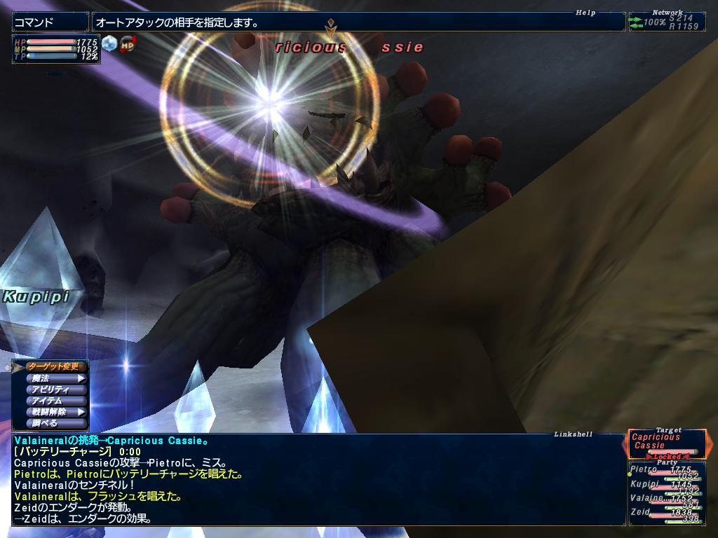 作戦はナイトのちゃーんがタゲを取って殴って削る。遠くからえりんぎさんが弓で削る。黒のぴえとろがワークスエーテルがぶ飲みで炎系精霊魔法で削る。ギャレンが思い出したようにクイックドローのファイアショットでレジられる。しりさんがガルーダのウィンドブレードなんかで削る。などなど。せいたんは主に支援。ぷるちねっらさんはリフレシュIIをしながら的の特殊技「光合成」のリジェネをディスペルで解除する。