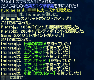 でもまあ勝てましたよ!ログにある朽葉のユグ準結晶っていうのがあると、西アドゥリンのINV前にいるNPCタルタルからメナスプラズム15万くらいと交換でウソンムンクとハイストリンガー+とかが交換できるのです!やった-!