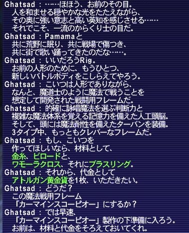 もう一回だけダルメル5、芋虫3の項目をやってからマウラでジョブチェンジしてアトルガン白門に行きました。オートマトン工房でクエストを受けて、指定された素材を競売買いするかー^^