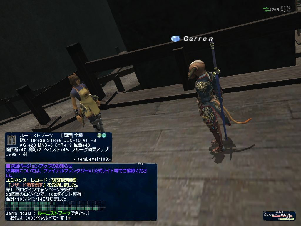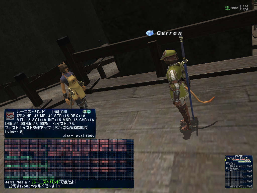 あと、アトヤクっていうIL115のチャッカがドロップする短剣の装備ジョブがシーフと踊り子だけだったのが赤とかコルセア、詩人、忍者ももてるようになったのかな?たぶん。コルセアように魔命+30を付けたよー。更に魔命+15付けようとおもったらチャッカのだいじをIL115片手棍のタマシチに使って合計魔命+45にしてたのでユムカクスのでリジェネ+3をつけておいたよー。