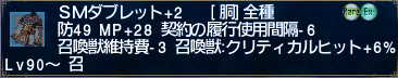 最近しりさんが召喚の装備を揃えているのに触発されて私も召喚の装備を揃えて鍛えてます。まずはサマナーダブレットをデュナミス-ボスディンだかで入手。それに忘れ去られた面影50個投入してSMダブレット+2(オーグメントなし)まで鍛えます。