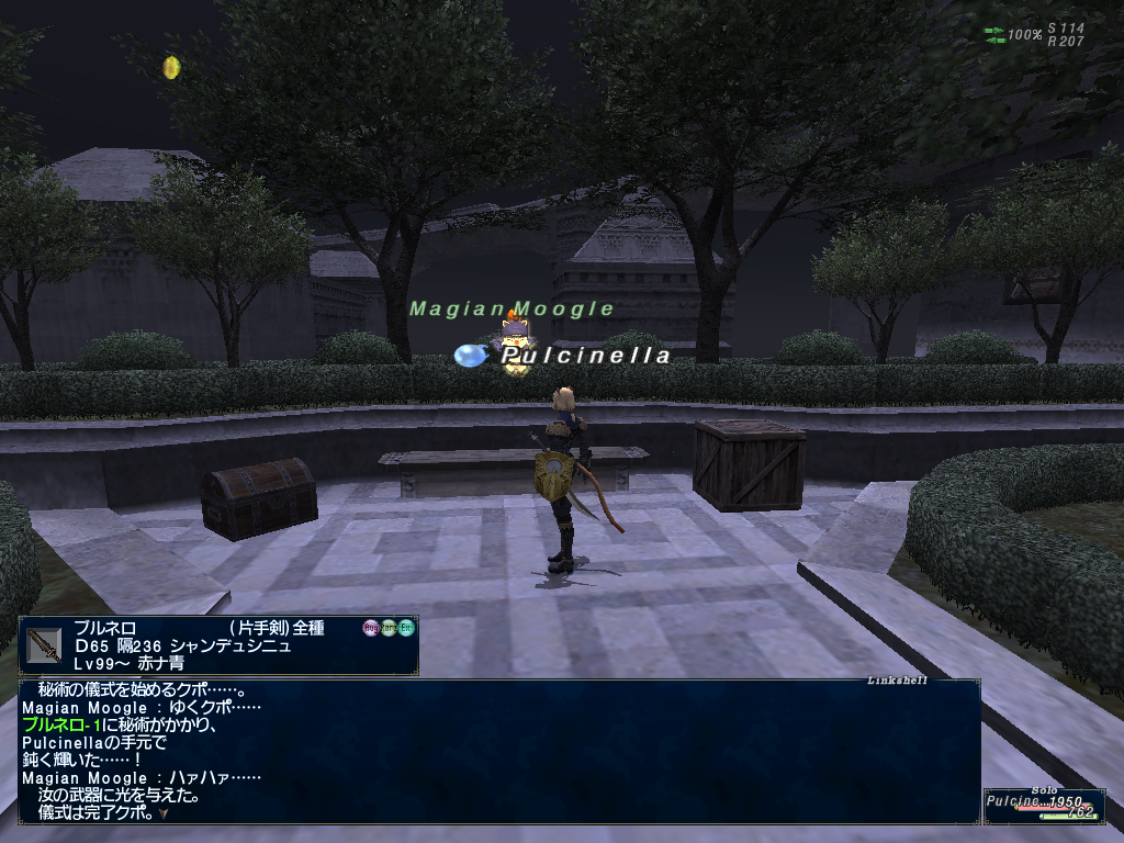この2個を持ってザルカバード〔S〕の幽門石から入ったウォーク・オブ・エコーズにいってクポフリートさんに秘術をかけてもらう。連続では作れないのでヴァナ0時をまわって2個目もゲット。秘は強いけど…なんつーか3桁ダメージの時がたまにあるなーw 先日ビシージで撃ったら600台がでてガックリしたw