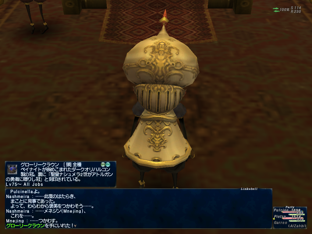 で、2垢と3垢のピエトロ君とぷるちねっらさんでアトルガンミッションをやってます。グローリークラウン(仮)を手に入れた直後取り上げられるあたりまで進みました。