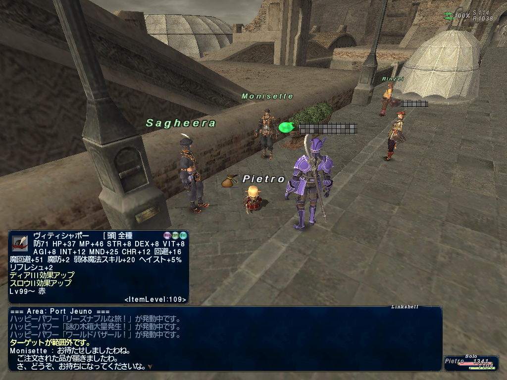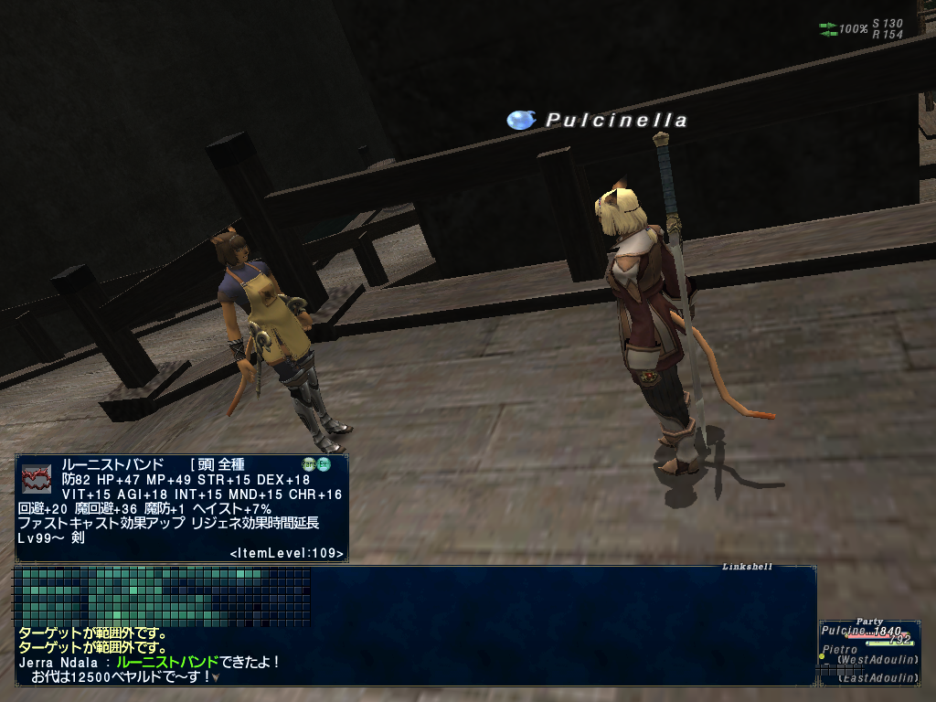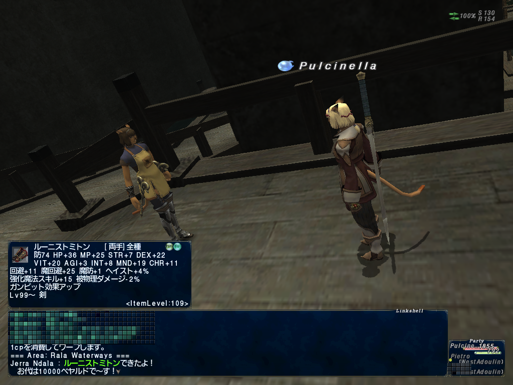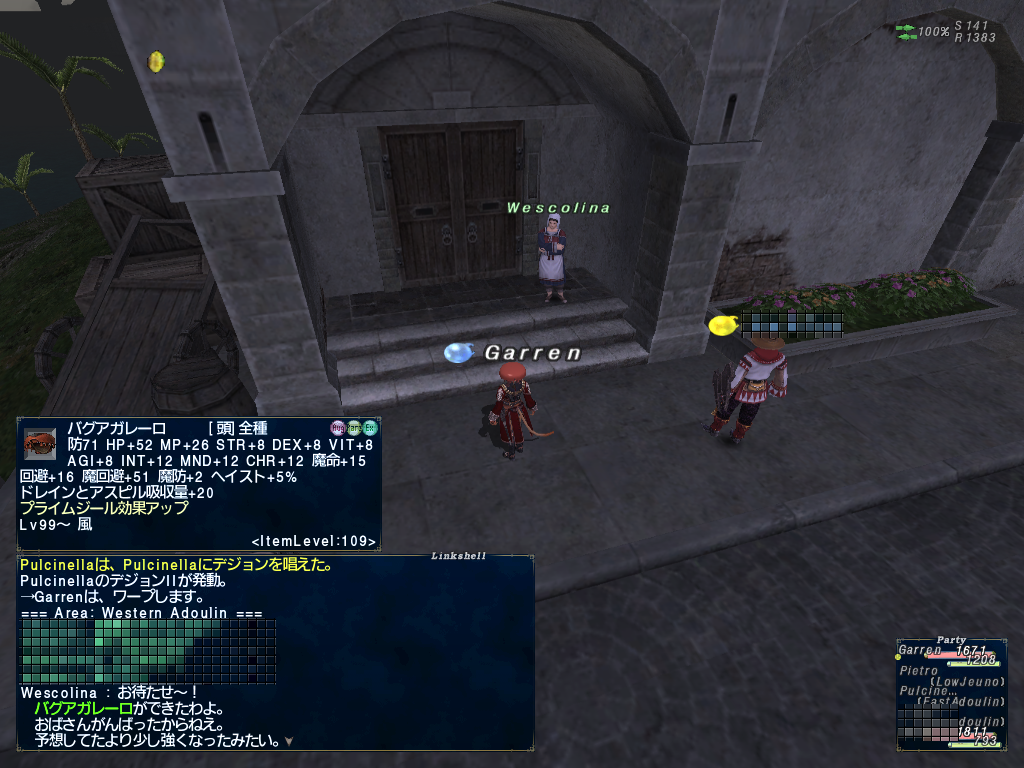 で、ぷるさーんが先日、魔導剣士Lv99になることができて、取りあえず装備はIL117のエミネンス交換で貰える後衛用のローブを着ていました。一式5ヶ所装備するとコンビネーション:リフレシュ+3なので結構便利。その装備を着てピエトロを連れて魔導剣士AF武器クエストをやりに行きました。センバクナーガンを70万ギルくらいで買ったからAF武器はいらないんだけど、やらないとAF防具クエ発生しねーから!