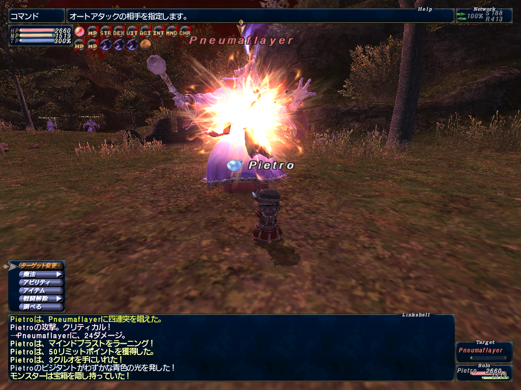 で、AF防具クエ2、エヌティエル水林でオロボンNM戦。魅了もあるよ。これはきつそうだったのでメインキャラのギャレンも持ってきて、召喚ギャレン、黒ピエトロ、黒プルチネッラの3人でやったら余裕でした。余裕で全滅です。なのでぽこめんに泣きついて手伝ってもらいましたでゅふふ。ぴえとろを赤にチェンジして、
