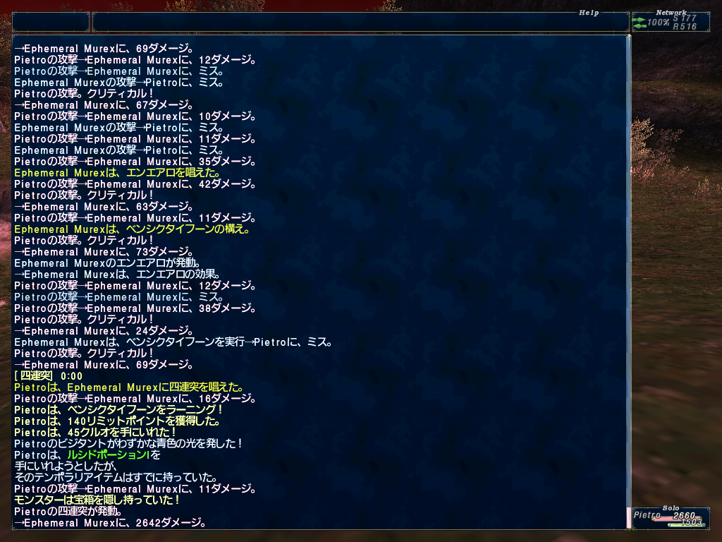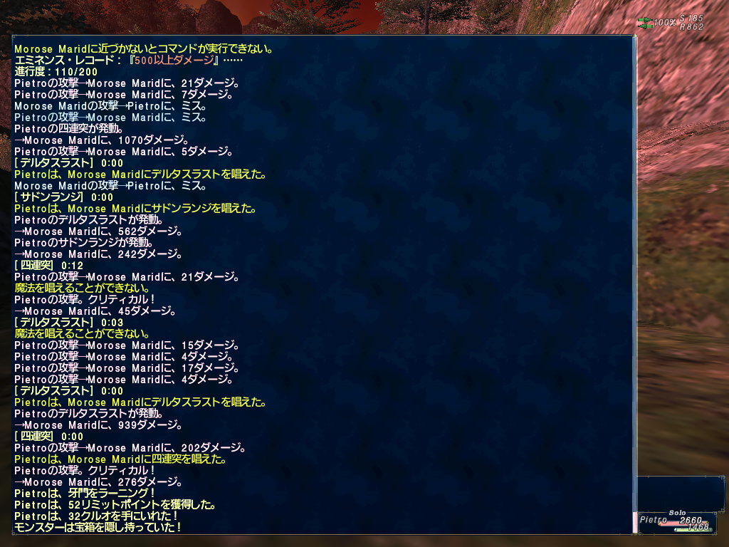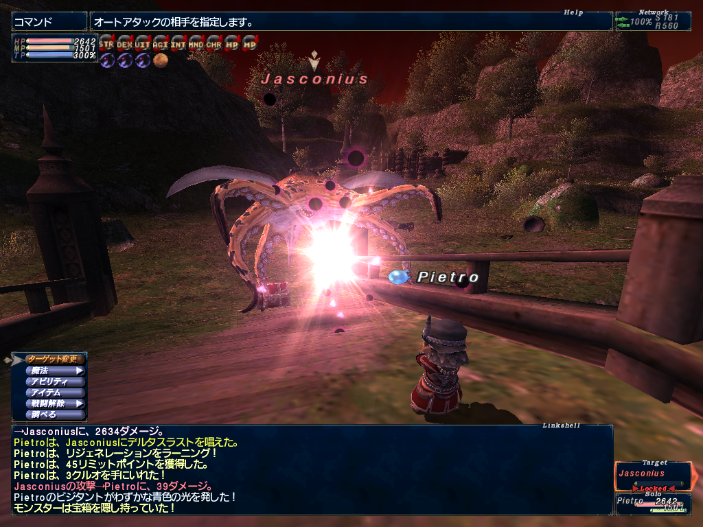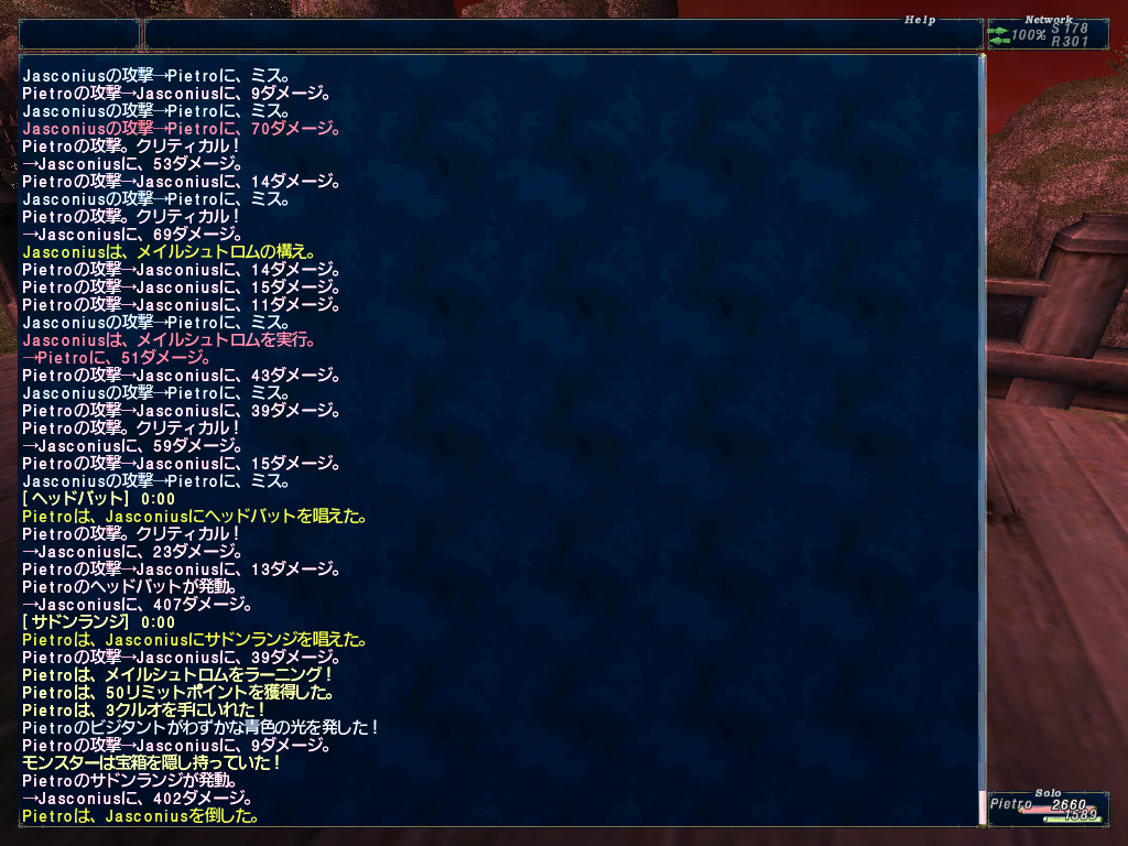 1回目、8分くらい戦闘して1/5くらい削って、戦闘自体は安定していたけど晩御飯タイムになったのでテレポで脱出。あ、ぷるさーんが魔導剣士で、ぴえとろは赤魔道士で行きました。