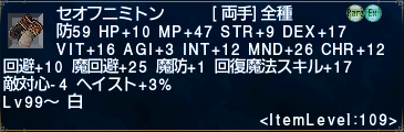 そういえば先日、上位レム物語のレム物語第六章がようやく8枚集まったので、素材がお手頃価格な頭用部位素材、マリヤカレヤオーブを使って風水士のアーティファクト頭をIL109からIL119に強化しました。
