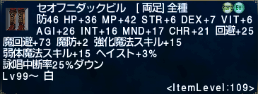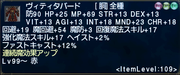 ファストキャスト装備で強化魔法とかを詠唱するときにAF119シャポーに着替えるけど、その他のときはだいたいVIシャポー+1を装備しています。次はヴィティタバードをIL109からIL119に強化素るんや…。イグドリア原木400万ギル以上するけど!あと、レム物語第7章も1枚ももってないけど!