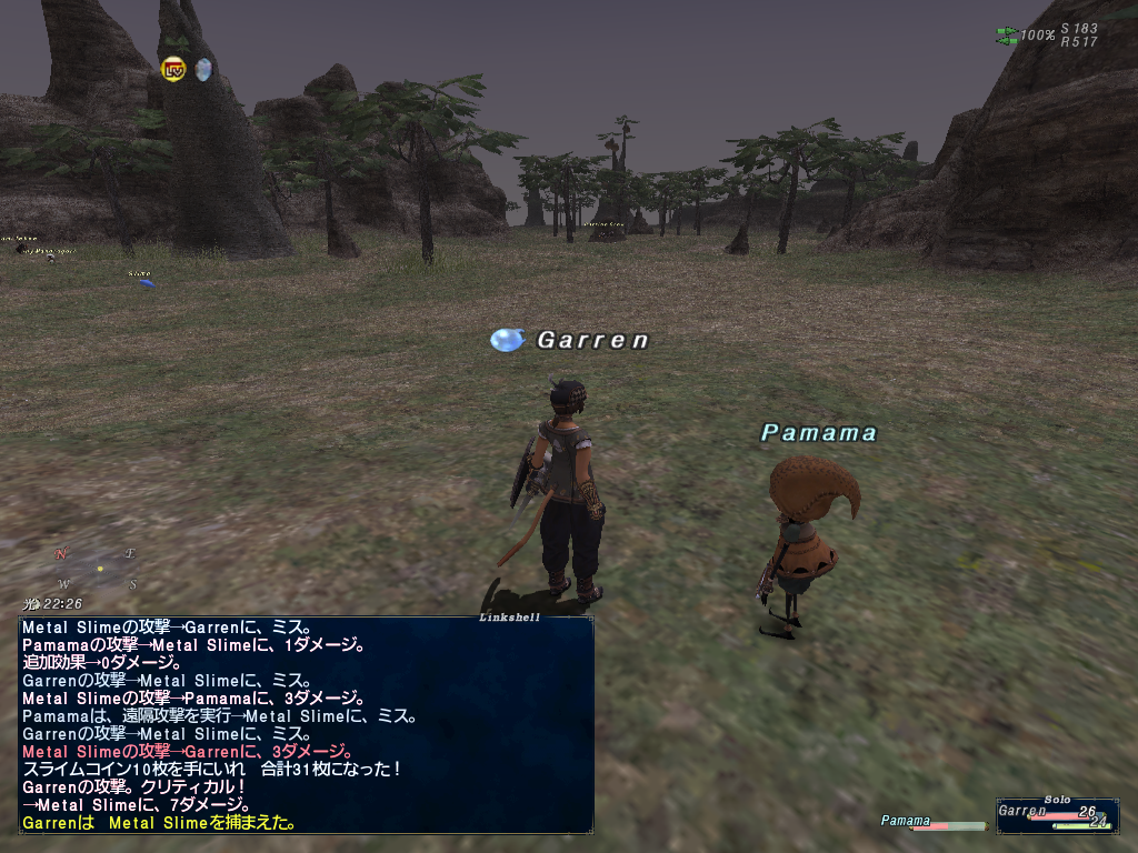 そして、FFXIVとDQ10とのコラボレーションイベント第2回が開催されていたのでスライムをボコっていたところ、戦闘終了しても戦闘音楽が続いていたのでなにかなー?とおもったらメタルスライムが赤ネームでわいて攻撃してきたのでマトンをけしかけつつ殴ったらなんとか倒せました。HPは4でしたが、回避がたかい。魔法は無効、属性WSも無効でした。