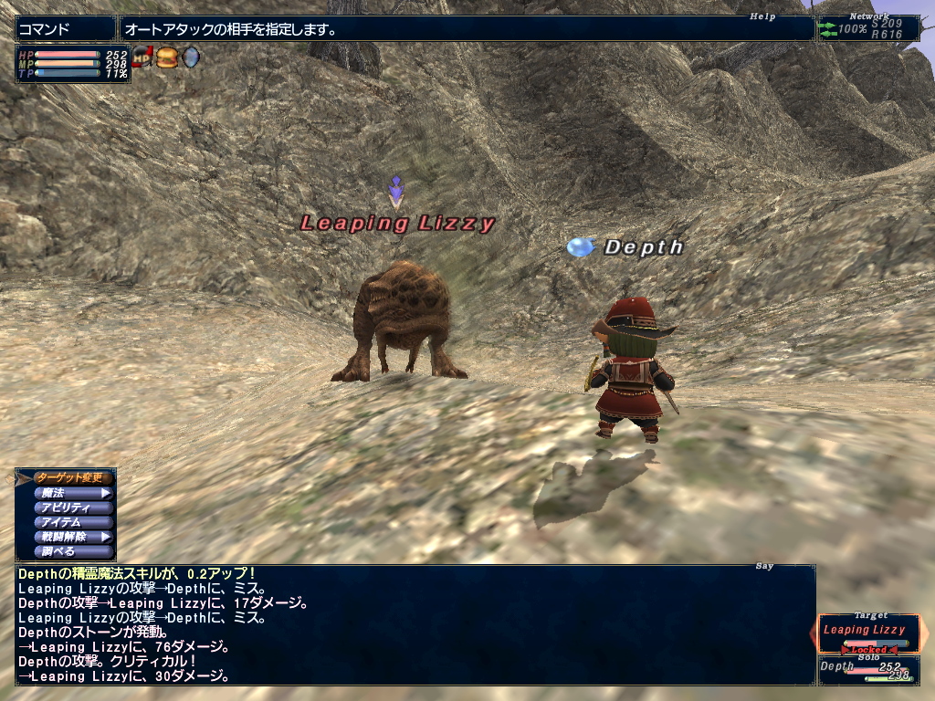 倉庫キャラでバストゥークにデジョンクエをやりに行っている途中のこと、あ、このキャラサンドリア生まれのタルタルなんです。南サンドリアからチョコボに乗って北グスタベルグのサバイバル本を触るためにチョコボを降りて、そこから徒歩で南グスタベルグをあるいていたら広域スキャンに(今は全ジョブで狭い範囲の広域スキャンが使えます)Leaping Lizzy的な名前を発見。早速倒してみる。Lv23黒魔道士でかてるのか!?余裕でした。まあノードロップでしたがね!