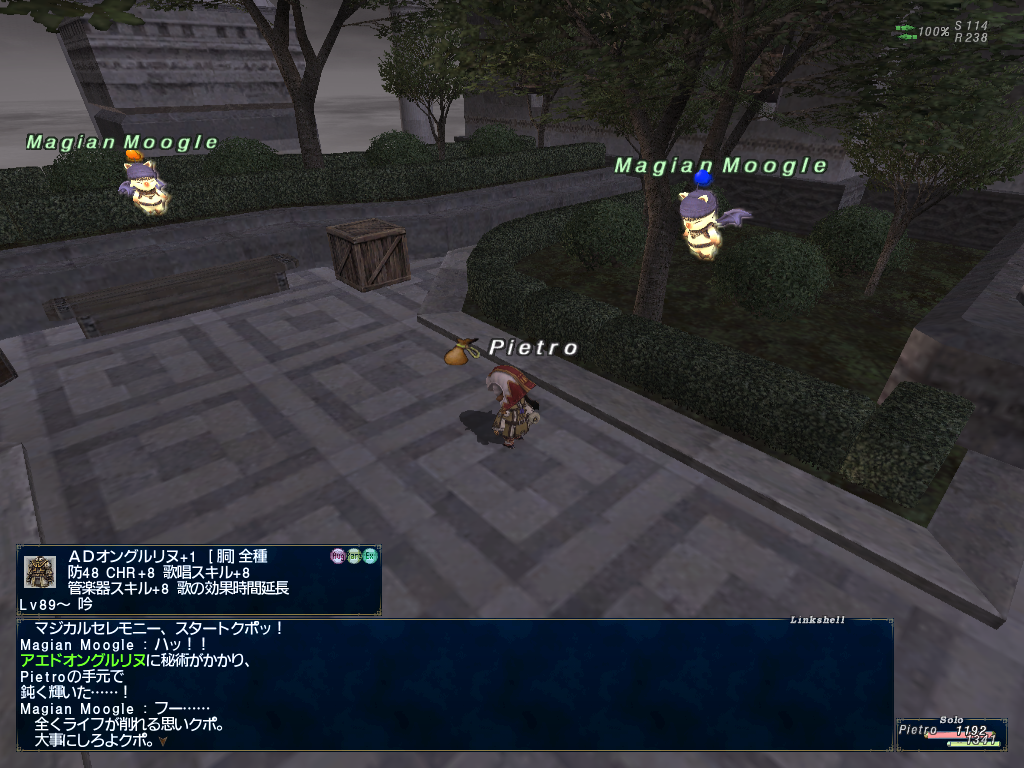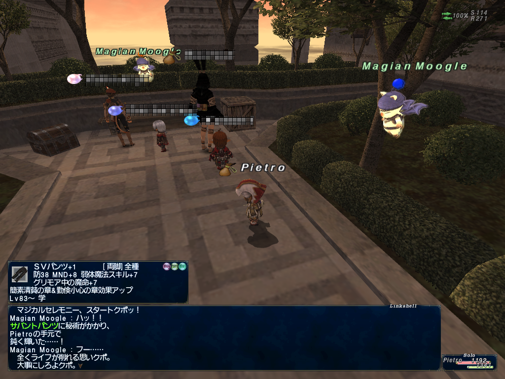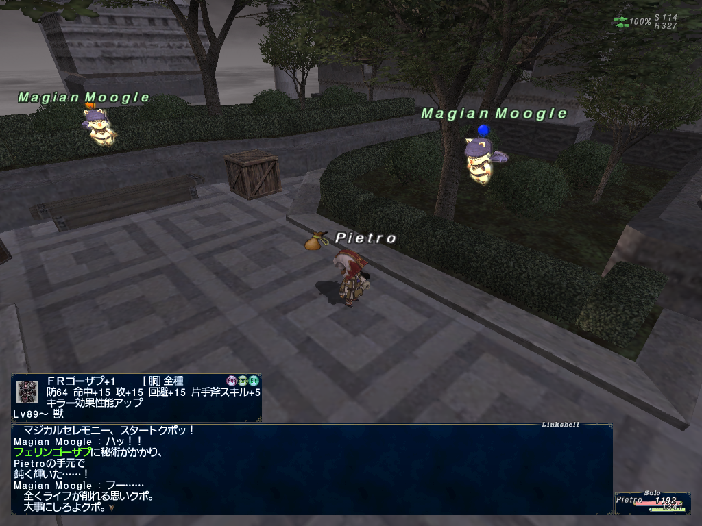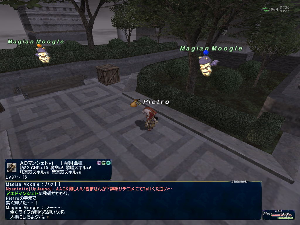ピエトロ君のかばんがやけにアイテムパンパンだなーとおもったらちょっと前の継続ログインキャンペーンでもらった、上げたジョブと上げる予定のジョブの型紙でかさばってたようです。倉庫キャラに送ってなかったのでありました。