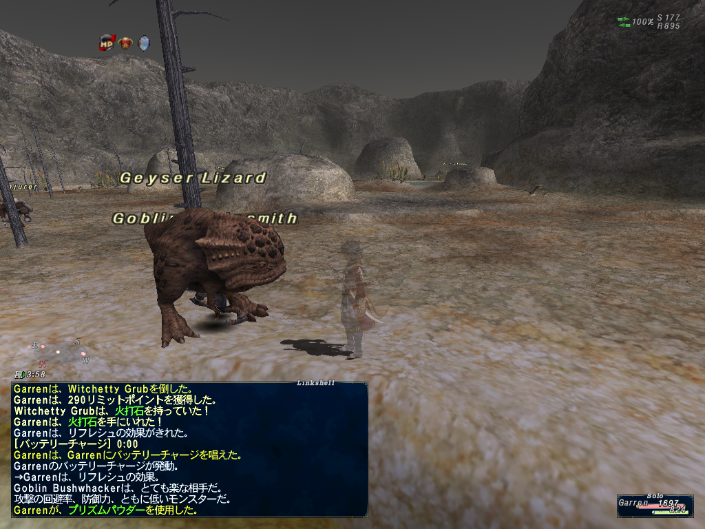 というわけでガイザーリザードさんにあいさつに行ったらLv90オーバーのゴブリンの群れの中に居たよ!そのときはサポシの青魔道士だったからプリズムパウダー使ってボコりにいった。