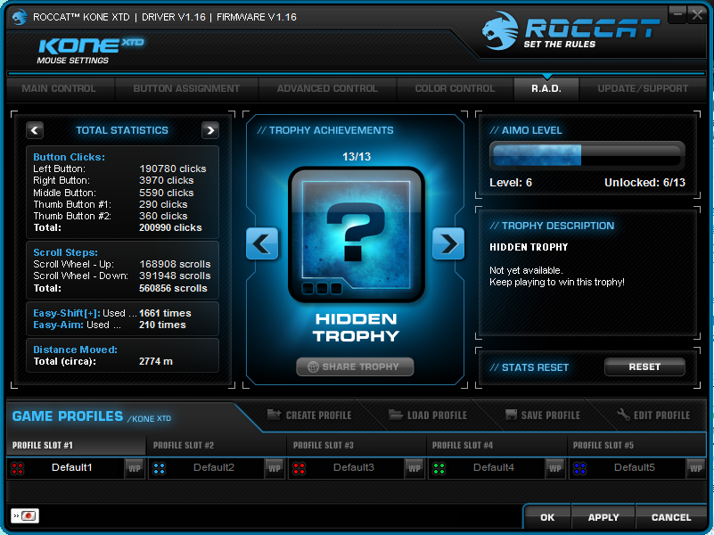 今メインで使っているデスクトップPCに接続しているマウスはROCCAT製のKONE XTDというマウスです。結構多機能で、ドライバというか設定ソフトでかなり色々設定できます。ボタンの数もそこそこあって、左クリック、右クリック、ホイールクリック、ホイールの奥側に1つ、ホイールの手前側に2つ、ホイールの左右チルト、左サイドに2つ、合計…たくさんあります!