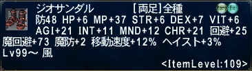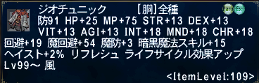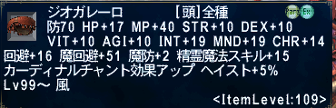 こんな性能。あとは脚装備のジオパンツなんですけど、NM戦があってちょっと面倒そう。なんでも魔道剣士かサポ魔道剣士の前衛でちびちび削ったり盾したりしつつ風属性精霊魔法で削るといいらしい?4人PTでいけたとかって記述をみた。まあ、いずれ行こう…。