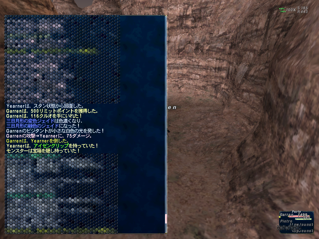 三日月型の変色ジェイドがあって、アビセア-タロンギの有色NMがオセロットトラウザを落とすというのでアビセア-タロンギで変色ジェイドに色をつけるべく変色NMをやる。1発色つき。