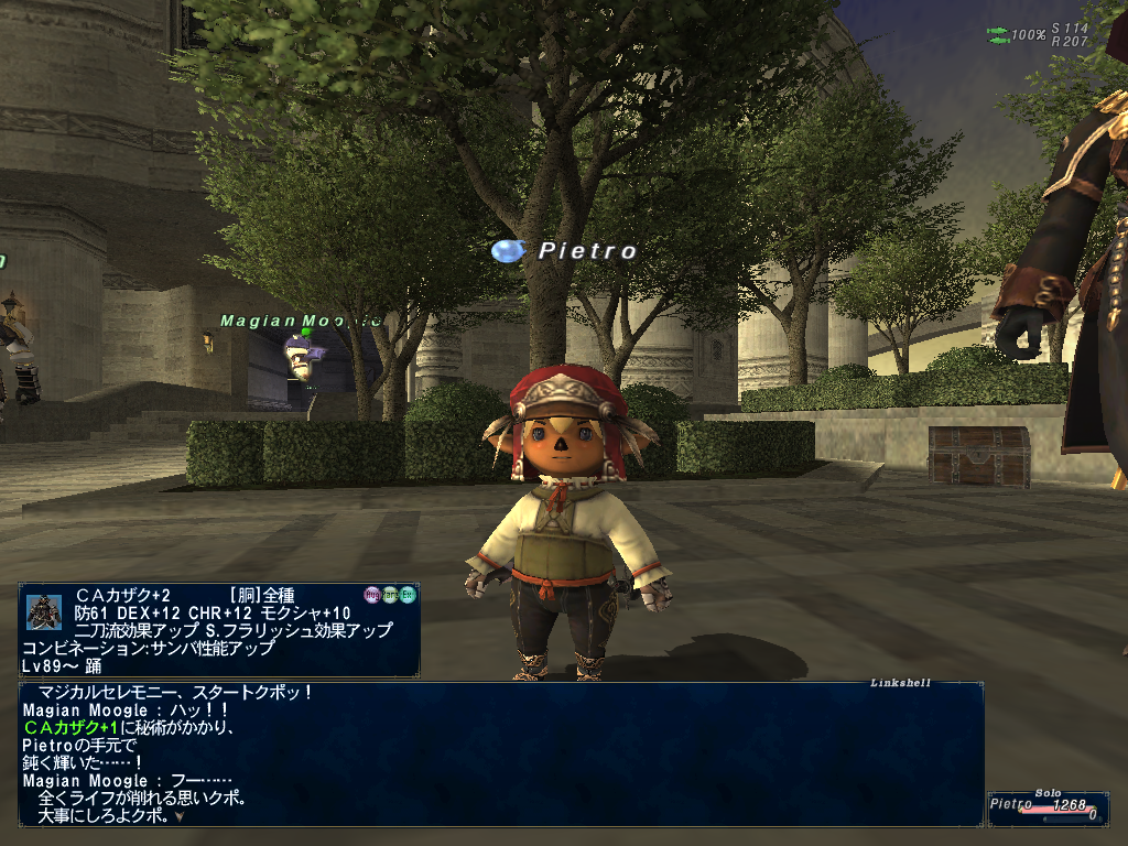 この日だったか?に、デュナミス-ブブリムクリアして、貨幣とか時間いっぱい稼いでから、ちゃーんとしりさんとぴえとろ、ぎゃれんの3人4キャラでデュナミス-タブナジアに行ってみたら、ちゃーん希望のデュエルシャポーと甲賀手甲がポロッと出た。おめでととすー^^