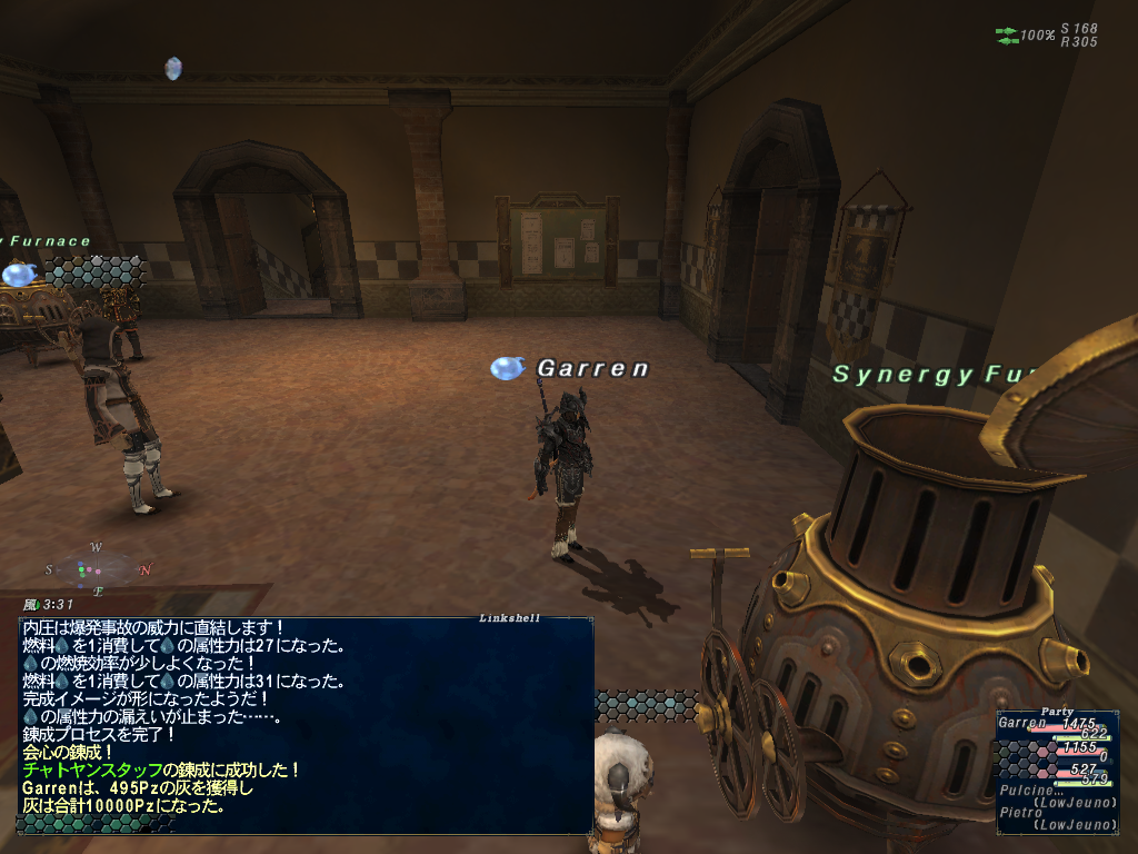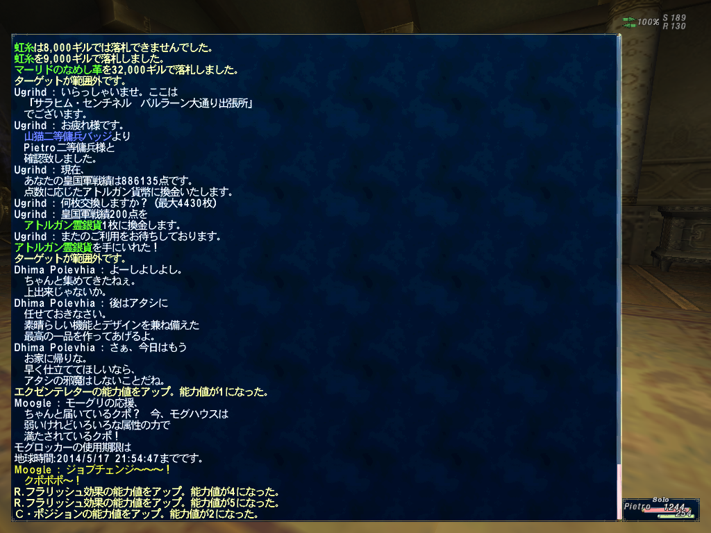 その日だったか、しりさんがソロでめりぽ貯めるためにアビセア-アルテパのドールをやってたので暗黒で寄生する。そのとき出た「雷の精霊石」の売上金が40万ギルになった!うめぇ!しりさんと山分けだー!ちなみに炎の精霊石だと200万ギル超えだそうな。