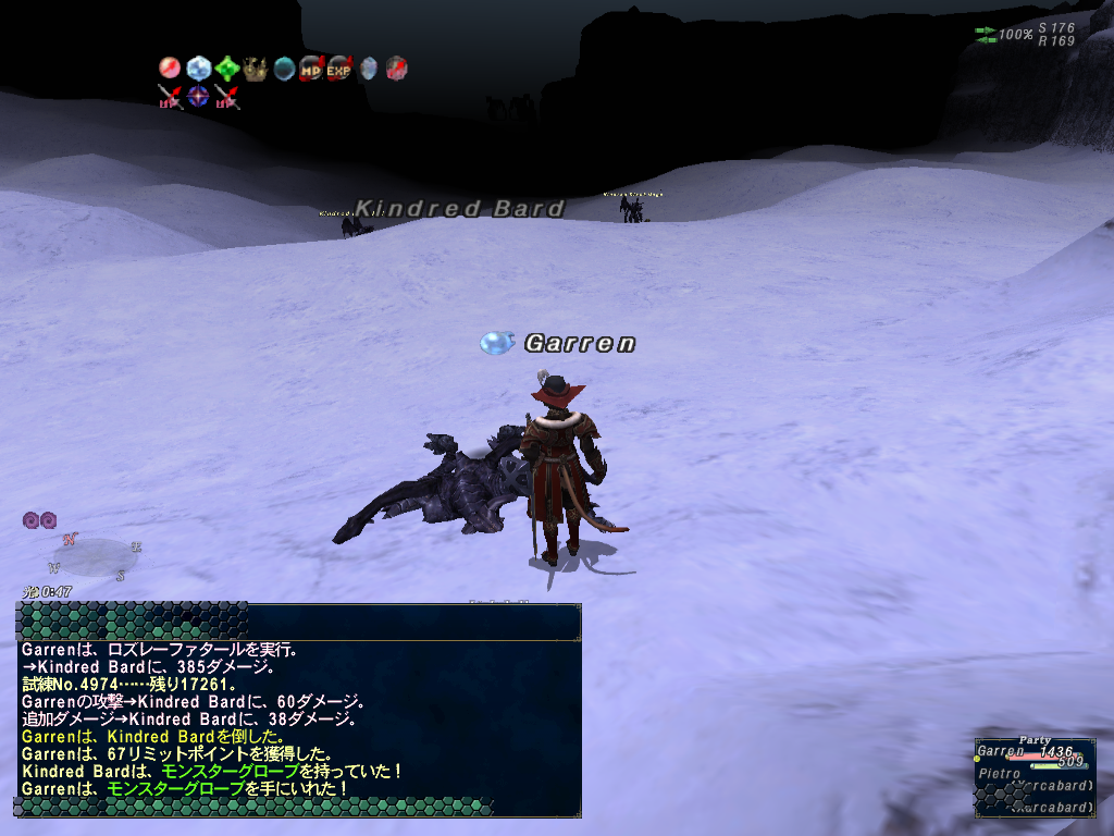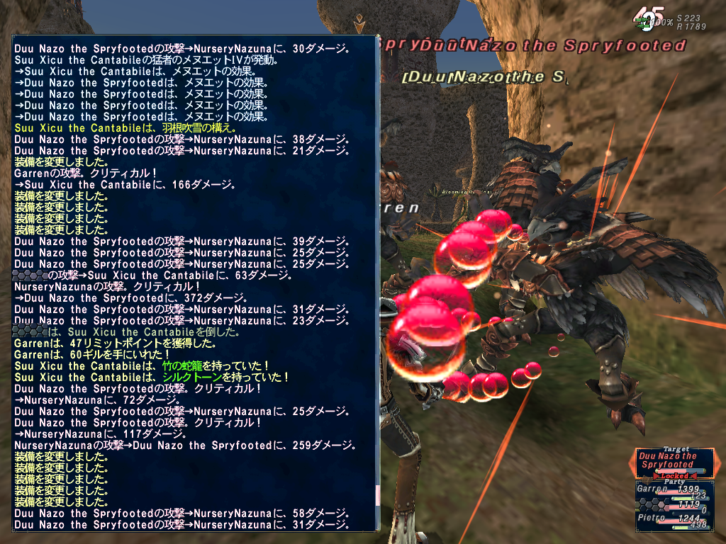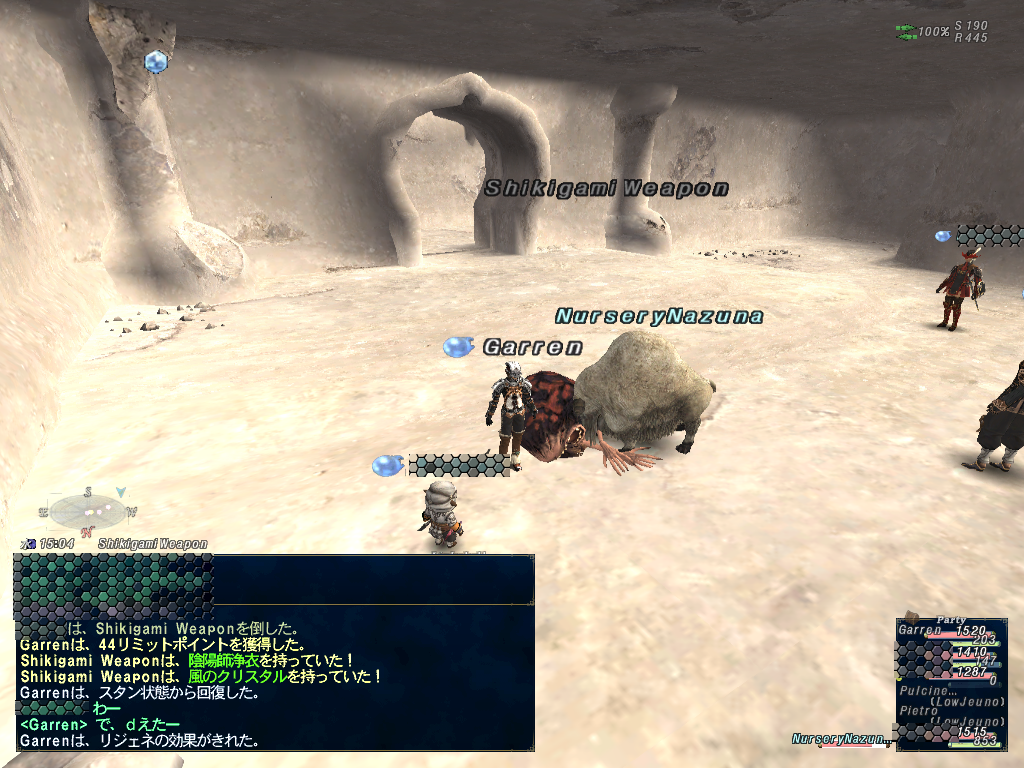 作戦を練ることにした。護衛ウィヴルは練るらしいので、夢想花を使ってねかせてから護衛ウィヴルを1匹ずつ撃破。ボスのクゥダフはHPが75%、50%、25%の時にインビンシブルを使うんだけど、そのとき以外は痛いWSを使ってこないらしい。まあ、護衛ウィヴルを全部倒してからぴえとろがタゲを持つ形でボスをボコってたら、インビン来て痛いWSもきた!蝉が2枚残ってたけど、追加効果のスタンを食らったらしく、動きを止められて死亡。その後、しりさんがとんずら使ってインビンを回避して云々かんぬん。まあ、なんていうか、普通にインビン中もスタンが入るみたいなのでサドンランジ入れればよかったらしい。まあなんとか勝利して報酬をゲット。
