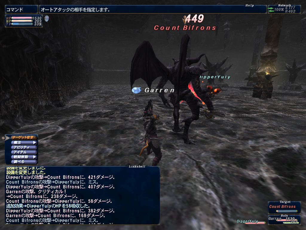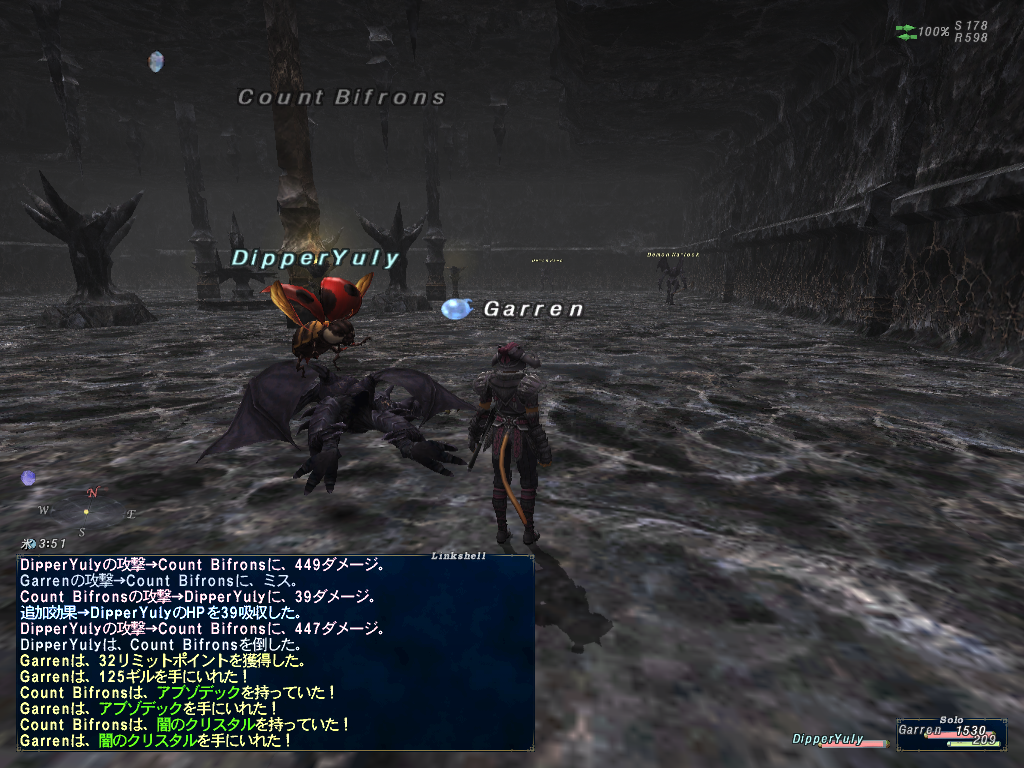 とかやってたら、その間しりさんは闇の精霊を落とすNMを張ってて、眠くなったので最後に沸かなかったら帰るといっていたターンでCount Bifronsが沸いたぞー!アブゾデックください!