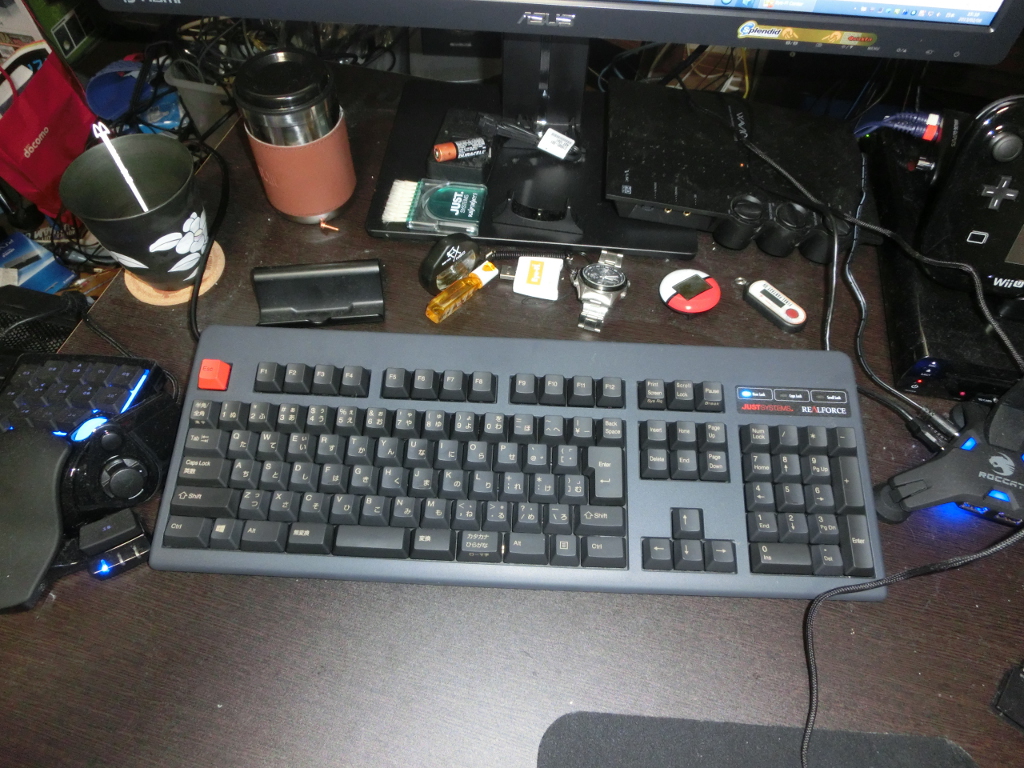 今まで使っていたキーボードはCORSAIRのVENGEANCE K90キーボードだったけど、そういえばマクロ機能なんて使わないことがわかったので、マクロキー分、幅の狭い方がいいなーということで。あと、東プレのREALFORCEって一度使ってみたかったんですよね。しっかりとした打鍵感と滑らかな押し心地。まあ、ちょっと打鍵開始時に力が必要ですけど。あくまで今まで使っていたキーボード比です。前のK90はメカニカルキーボードで、打鍵感もよく押し込みが若干軽くてとても入力がしやすかったです。しかし個体差か何かわかりませんが、たまに同一キーが連打状態になることがあってちょっと不便してました。