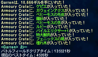 あと、私の希望で獣神印章99BF「動く島」に行ってきた。狙うはもちろん「アダマンタスの卵」。私もかねてより黒帯が欲しかったのですよ!茶帯クエストまで終わってますし!モンクのレベルはまだ15ですが!