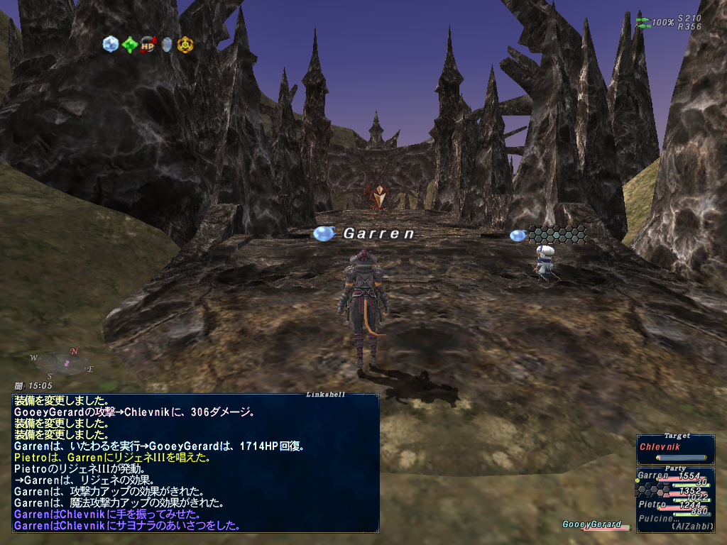 取りあえずしりさんが準備中(モンクで打時間対策)に、暗/忍(Garren)、白/黒(Pietro)の2キャラで偵察に行った。Garrenのアートマは終焉、灰燼、邪鬼だったかな。トリプルアタックとオートリレイズ目当てで終焉、通常攻撃のクリティカル目当てで灰燼。多分…あとはMP回復目的で邪鬼を付けたような気がするけど、もしかしたらリジェネ目的で無常だったかも。ぴえとろは、弱点のTP用に極彩、あとはリフレシュ用に天導と邪鬼だったか。